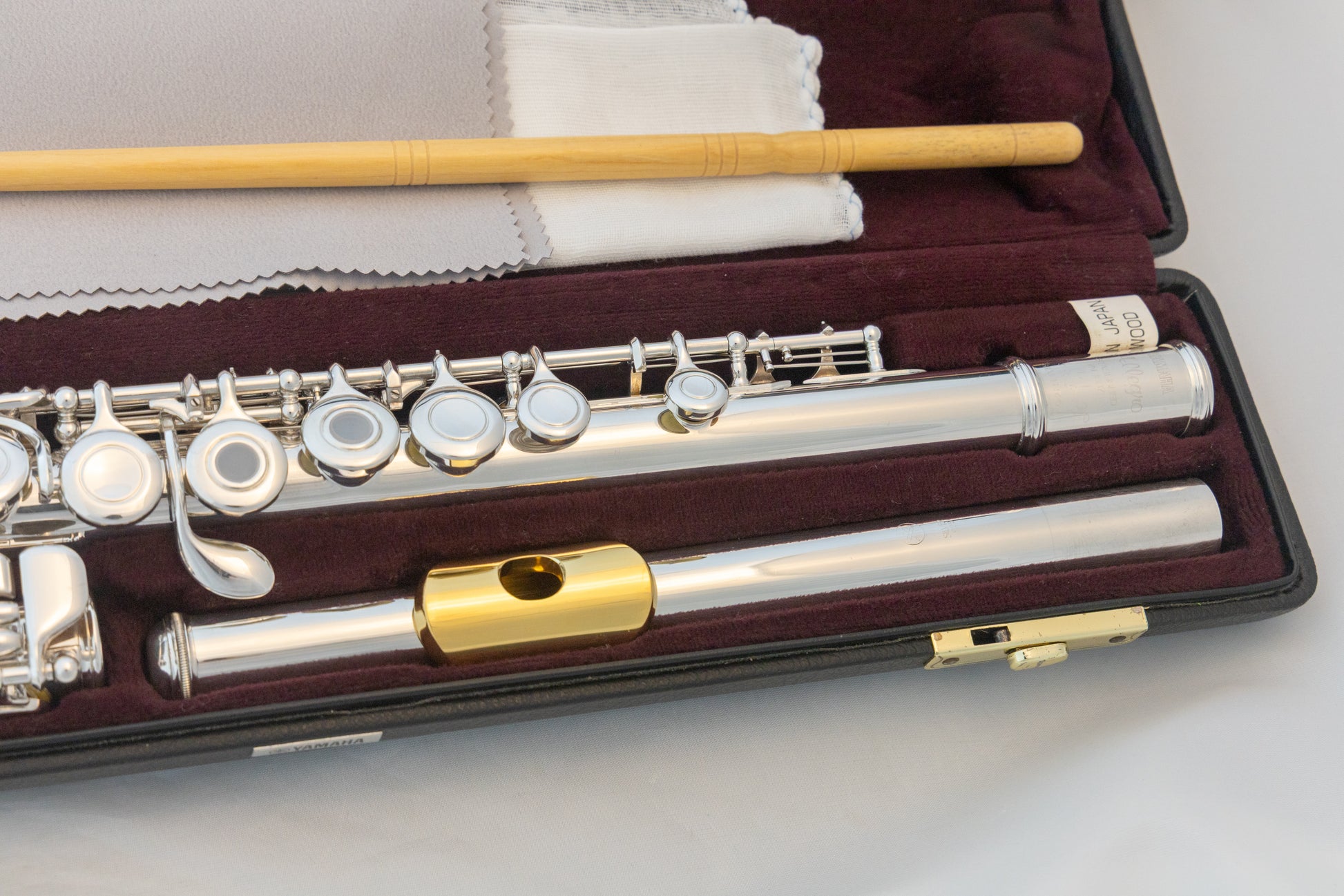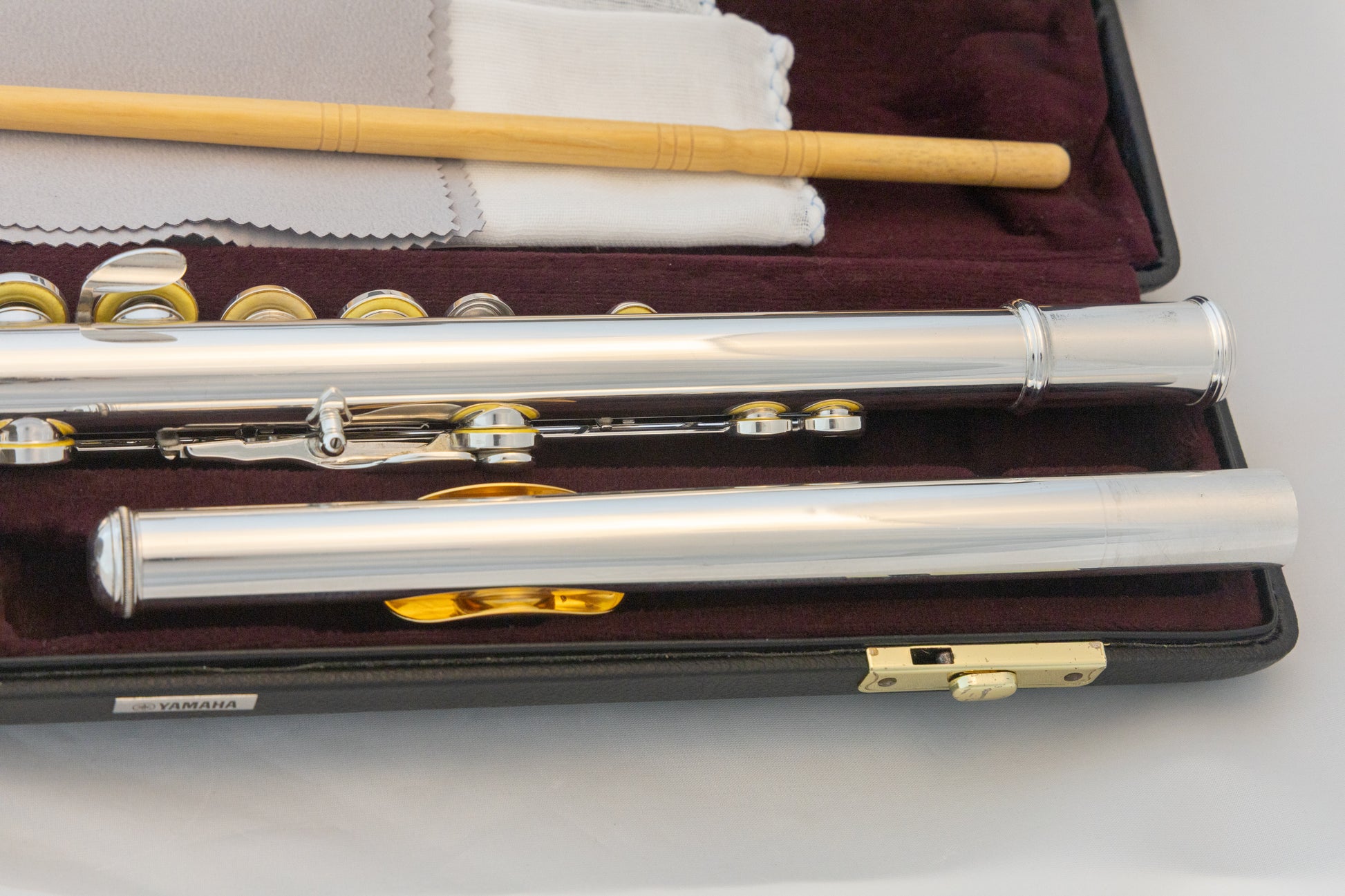 Yamaha YFL-471 Allegro intermediate all sterling silver open-hole flute with low-B foot, split-E mechanism, gold-plated headjoint, with original hard case and leather carrying bag. SN# 964544